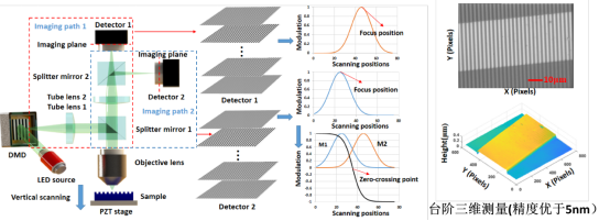 基于編碼成像差分探測納米級三維測量在編碼圖像在焦面處成像最清晰,調制度取得最大值,通過構建差分探測系統,提取差分調制度零點所在位置實現高精度三維形貌重構。
